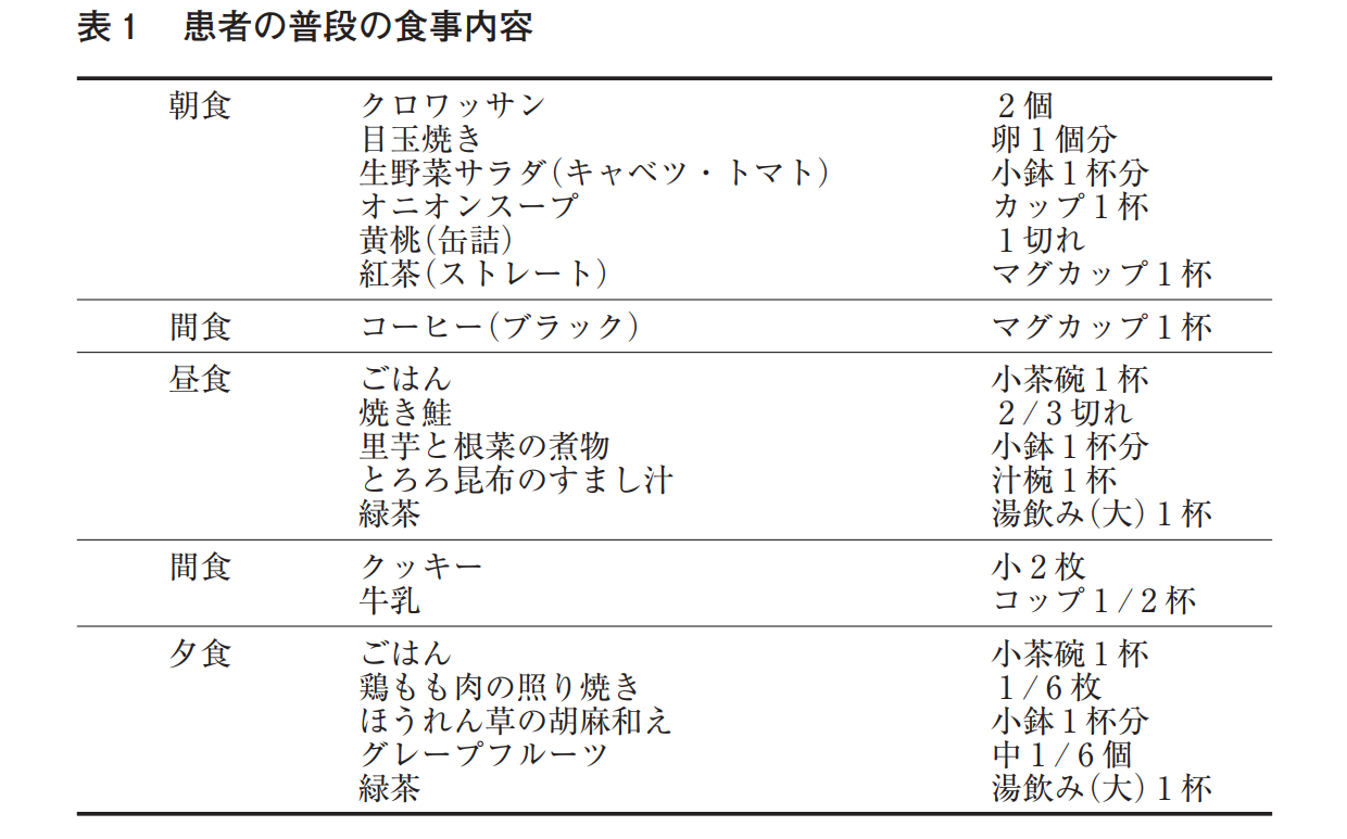 【問】K 透析クリニックに勤務する管理栄養士である。患者は、47 歳、女性。糖尿病腎症により、週 3 回の血液透析を行うため通院している。身長 150 cm、ドライウエイト 50 kg、標準体重 50 kg、尿量 200 mL/日、透析間体重 増加量 4 kg(中 2 日)。透析前の血液検査値は、HbA1c 7.6%、尿素窒素 53 mg/dL、クレアチニン 8.5 mg/dL、ナトリウム139 mEq/L、カリウム 4.8 mEq/L、リン 4.8 mg/dL。普段の食事内容を聞き取った(表 1 )。