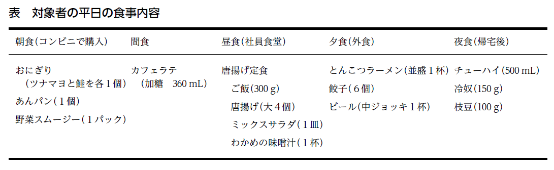 【問】K 社健康保険組合の管理栄養士である。対象者は、40 歳、男性。喫煙習慣なし。一人暮らし。昔からお酒が好きだが、体重が増えてきたので、外食のビール1杯と家ではチューハイ1缶で我慢している。小学生の頃に、サッカーを始め、大学まで打ち込んできた。就職してからもサッカーを趣味として続けていたが、忙しくなり 30 歳からやめている。30 歳台から体重が増加していたが、あまり気にしてこなかった。40 歳時の健診で、特定保健指導の動機付け支援の対象となった。身長 178 cm、体重 90 kg、BMI 28. 4 kg/m2、腹囲98. 5 cm。20 歳時の体重 72 kg。血圧 128/82 mmHg。空腹時の血液検査値は、総コレステロール 190 mg/dL、トリグリセリド 185 mg/dL、LDL コレステロール 110 mg/dL、HDL コレステロール 43 mg/dL、血糖 98 mg/dL、HbA1c 5. 5%。平日の食事内容は、表のとおりである。