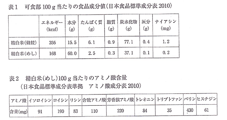 日本人の主食であるご飯に関する記述である。精白米(穀粒)および精白米(めし)の一般成分およびナイアシン含量は、表1の通りである。また、表2には精白米(めし)のアミノ酸組成を示した。