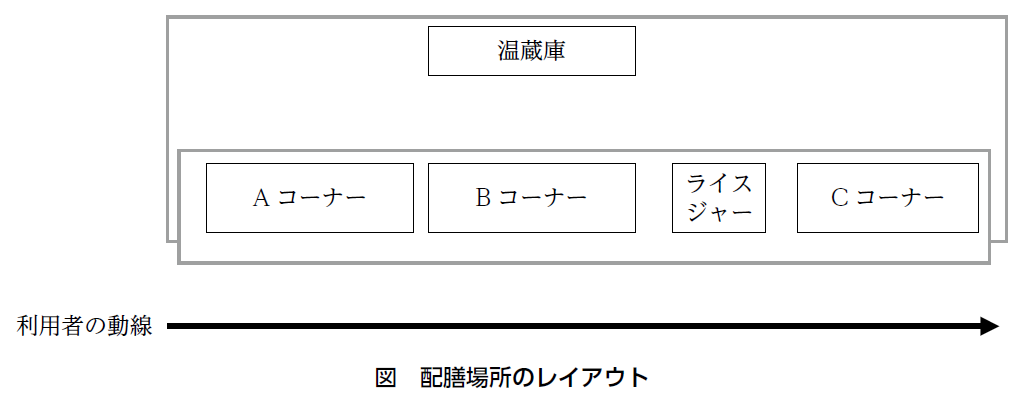 【問】K 事業所の食堂では、対面サービス方式で給食を提供している(図) 。各料理を適温で効率よく安全に提供したい。鶏の唐揚げ(付け合わせ:トマト、レタス) 、小松菜のお浸し、味噌汁、ご飯の献立の場合、提供場所(A〜C コーナー) と料理の組合せとして、最も適当なのはどれか。1つ選べ。