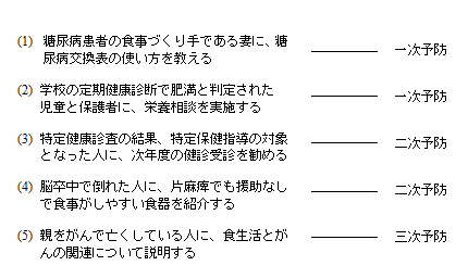 【問】対象者の健康状態に応じた栄養教育と、疾病予防における一次・二次・三次予防に関する組合せである。正しいのはどれか。 1つ選べ。[画像へ]