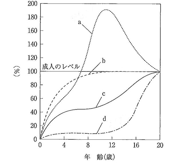 【問】スキャモンの発育曲線における4つの成長型の図である。正しい組合せはどれか。1つ選べ。[画像へ]a b c d