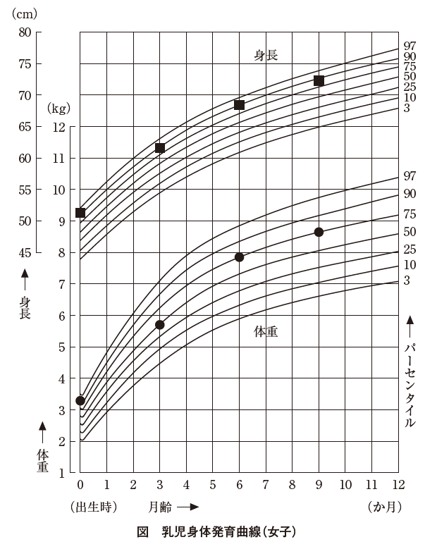 A子の出生時からの身長と体重の変化を乳児身体発育曲線に示した(図)。A子の栄養アセスメントの結果である。最も適切なのはどれか。1つ選べ。