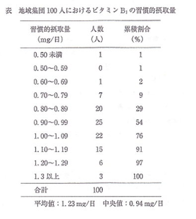 【問】ある地域集団100人に対して行った食事調査の結果を表に示した。日本人の食事摂取基準(2010年版)を用いて評価したときの、この集団におけるビタミンB1の不足者割合である。正しいのはどれか。1つ選べ。