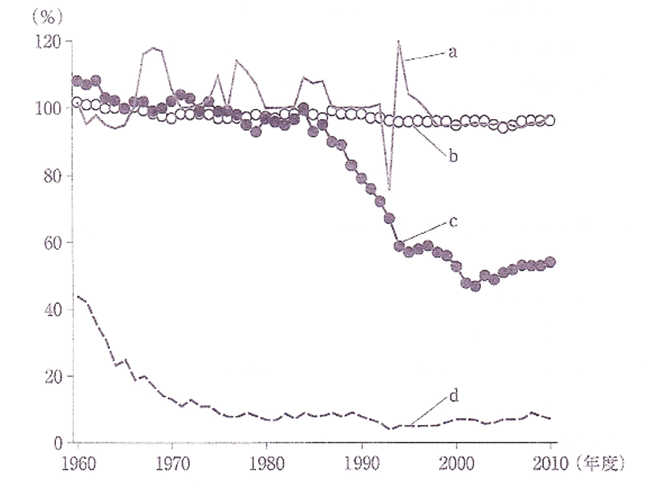 【問】わが国の食料自給率のうち、品目別自給率の年次推移を図に示した。図のa〜dに相当する食品の組合せである。正しいのはどれか。1つ選べ。[画像へ] a ― b ― c ― d
