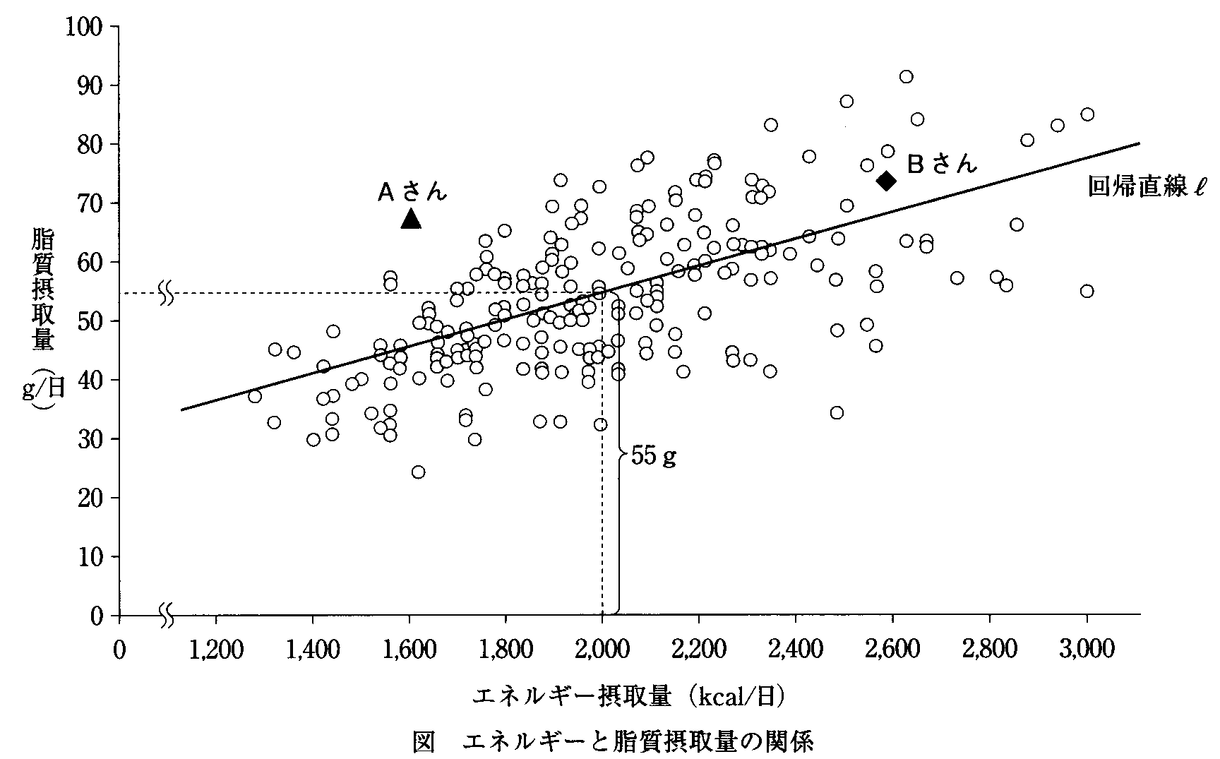 b 残差法によるエネルギー調整後の脂質摂取量は、AさんもBさんも55gより高値である。