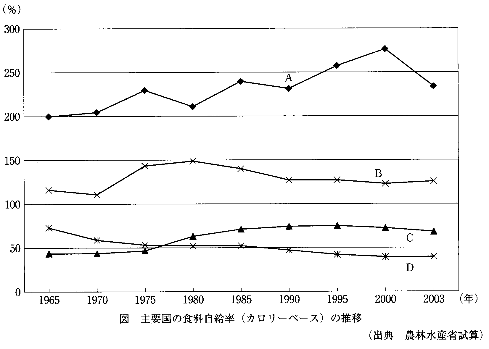 【問】下図は、主要国の食料自給率(カロリーベース)の推移を示している。A〜Dに該当する国として、正しいものの組合せはどれか。[画像へ]