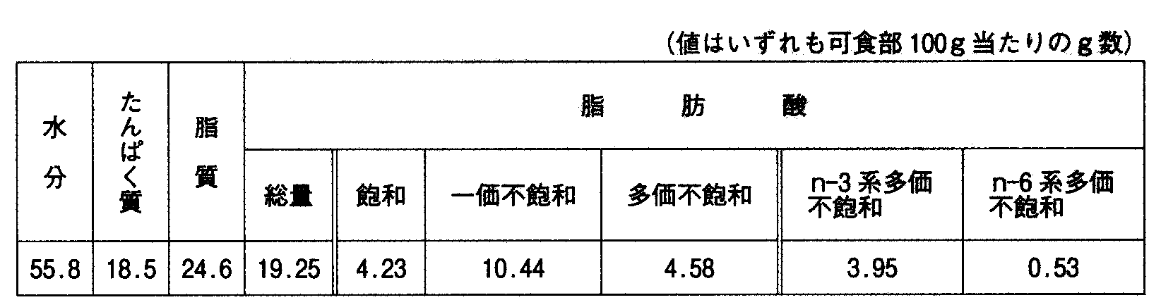 【問】下表は、ある食品の栄養成分について、五訂増補日本食品標準成分表(脂肪酸成分表を含む)の一部を抜粋したものである。