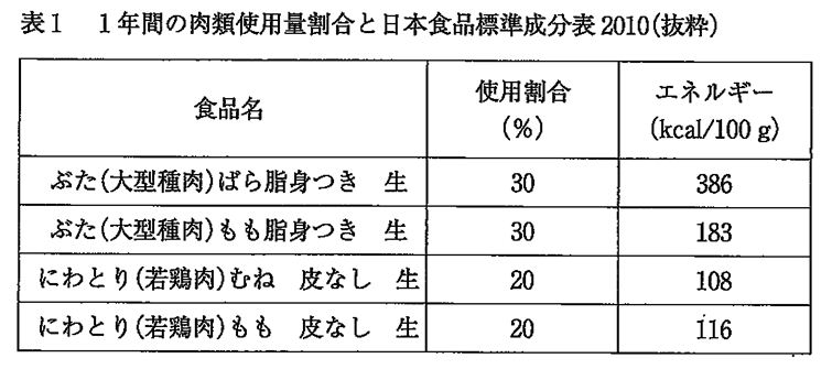 【問】施設Aは、社員の昼食に複数定食を提供している特定給食施設である。施設の食品群別荷重平均成分表を利用して食品構成と栄養出納表を作成している。表1は、施設Aにおける1年間の肉類使用量割合とそれに対応する日本食品標準成分表2010の可食部100g当たりのエネルギー量である。