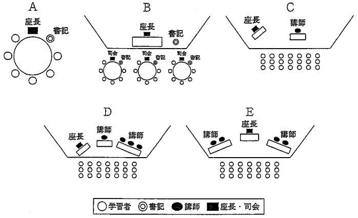 【問】栄養教育を目的とした集団討議法と、人の位置関係を示した図の組合せである。正しいのはどれか。1つ選べ。[画像へ]