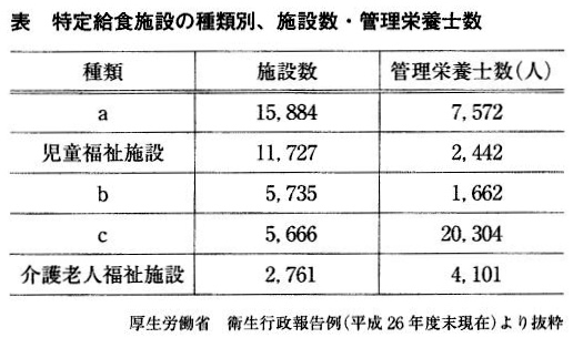 【問】全国の特定給食施設について、施設数が多い順に上から、施設数と管理栄養士数を示した表である。a、b、cの施設の組合せとして正しいのはどれか。1つ選べ。