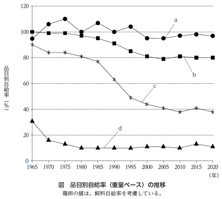 【問】食料需給表から算出された、わが国の食料自給率のうち、米、野菜、果実、鶏卵の品目別自給率(重量ベース) の年次推移である(図) 。鶏卵については、飼料自給率を考慮した値である。図のa〜dに該当する食品の組合せとして、最も適当なのはどれか。1つ選べ。