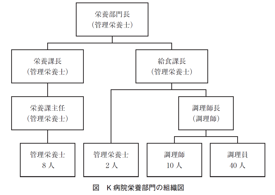【問】K 病院栄養部門(図)の組織・人事管理に関する記述である。最も適当なのはどれか。1 つ選べ。[画像へ]