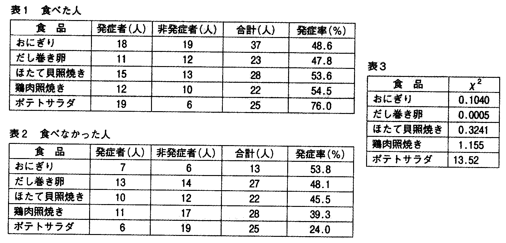 【問】50名の会食で25名が、食事を摂った4時間後に激しい嘔吐に加えて、腹痛と下痢を生じた。発熱はなかった。マスターテーブルを作成したところ表1、表2のようになった。また、χ2(カイ2乗)検定を実施したところ表3の結果を得た。[画像へ]この食中毒を予防する方法として、最も効果的なものはどれか。