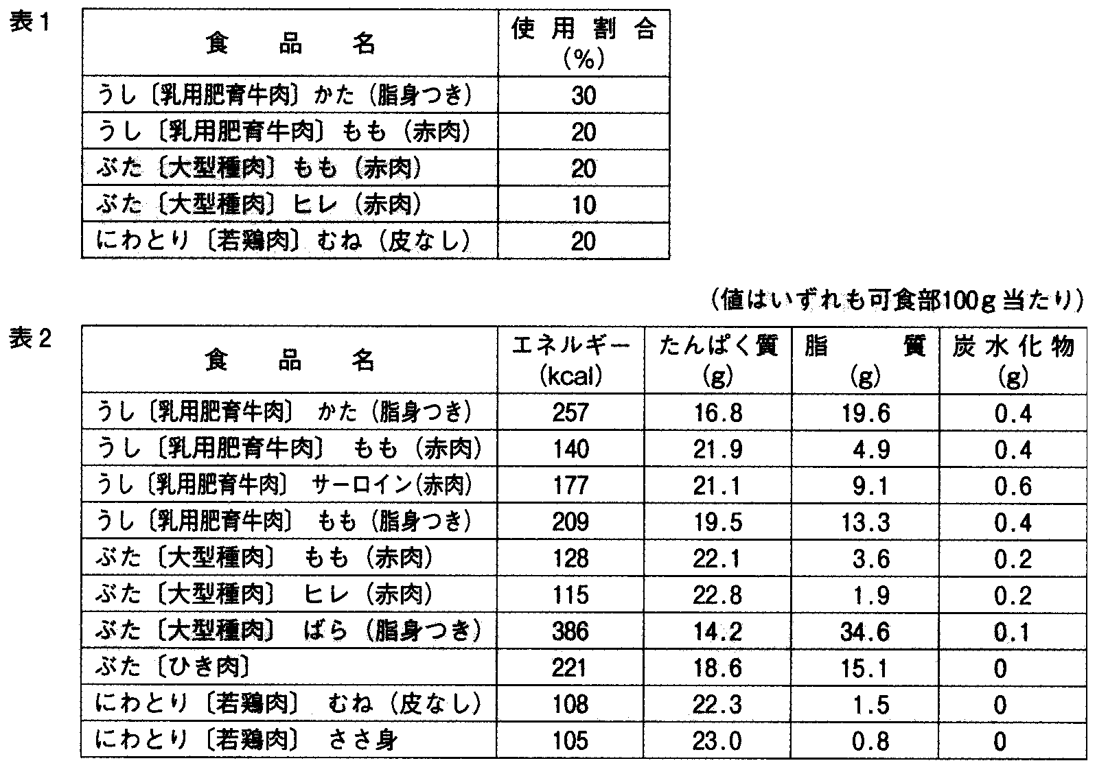 【問】特定給食施設Aのサイクルメニュー(30日間)における肉類使用量の実績は表1の通りであった。表2は、五訂増補日本食品標準成分表の抜粋である。[画像へ]問題199 このサイクルメニューにおける肉類の食品群別荷重平均エネルギー量(100g当たり)である。正しいのはどれか。