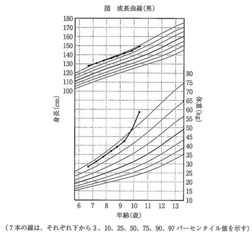 Aさんは、10歳4か月、男児。身長149 cm、体重58.0 kg、肥満度39.5%。入学時からの身長、体重測定データを、成長曲線上に整理した(図)。