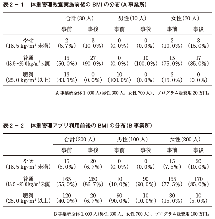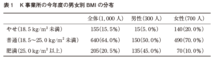 【問】K事業所に勤務する管理栄養士である。来年度から始める体重管理プログラムを検討している。 K事業所の従業員は1,000人(男性:300人、平均年齢42歳、女性:700人、平均年齢37歳)であり、近年、高血圧と糖尿病の罹患者が増加している。表1はK事業所の従業員の今年度のBMIの分布である。なお、K事業所の来年度のプログラム実施の予算は100万円である。