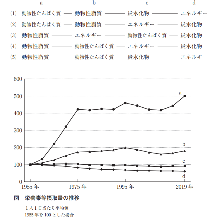 【問】国民健康・栄養調査(国民栄養調査)結果の栄養素等摂取量について、年次推移を図に示した。図のa〜dに該当する組合せとして、最も適当なのはどれか。 1 つ選べ。[画像へ]