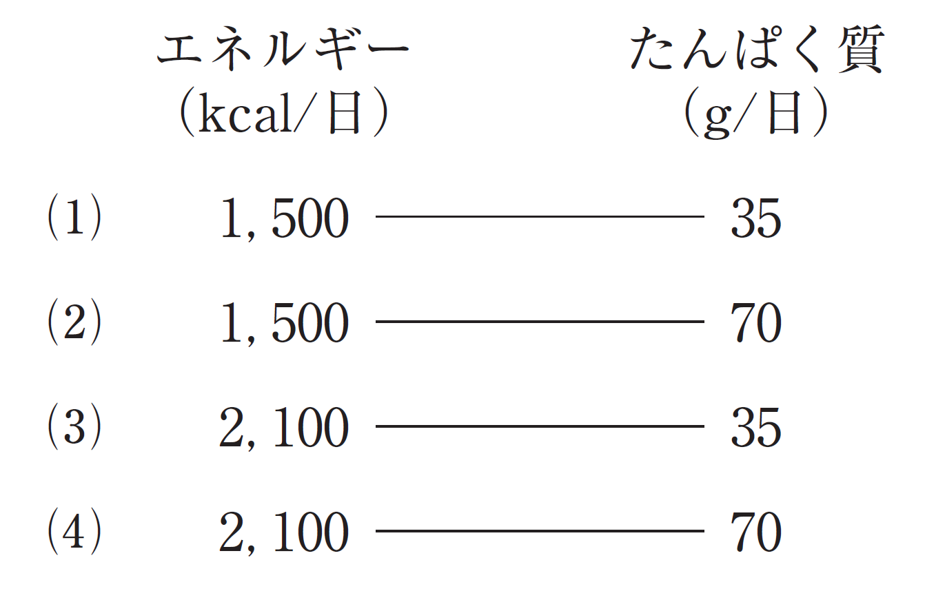 この患者における、1 日当たりの指示エネルギー量と指示たんぱく質量の組合せである。最も適切なのはどれか。1 つ選べ。