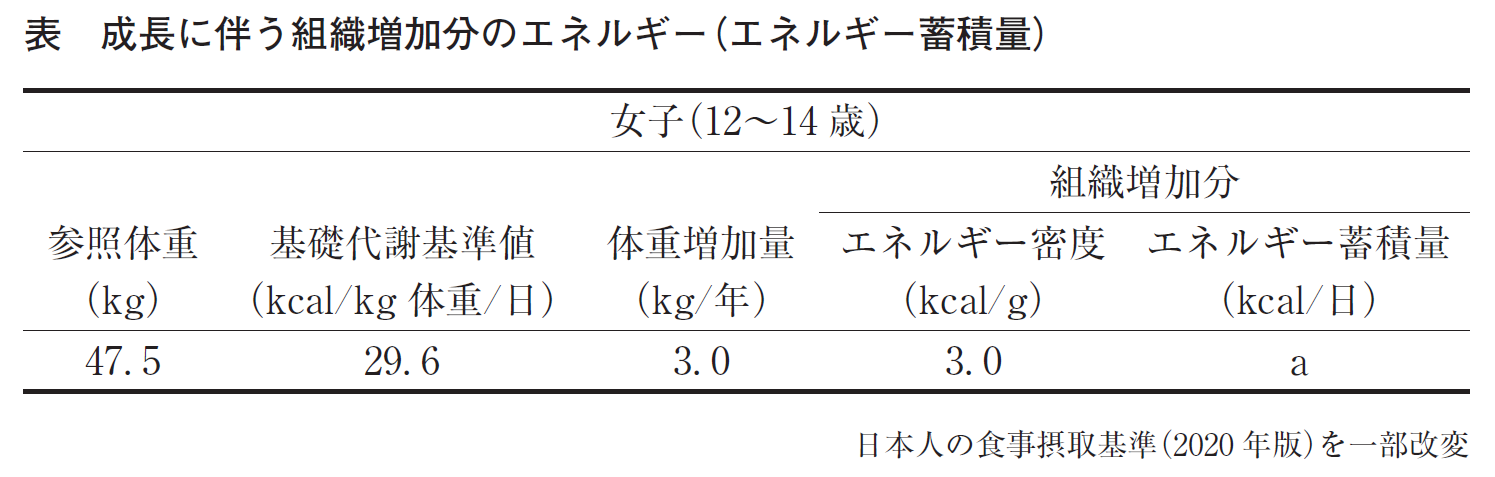 【問】日本人の食事摂取基準(2020 年版)における、12〜14 歳女子の成長に伴う組織増加分のエネルギーである(表)。表のaの値として、最も適当なのはどれか。1 つ選べ。[画像へ]