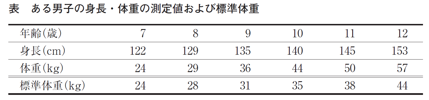 【問】ある男子の身長と体重を年1 回測定した。それらの記録と、標準体重の値である(表)。この男子が初めて肥満と判定された年齢として、最も適当なのはどれか。1 つ選べ。[画像へ]