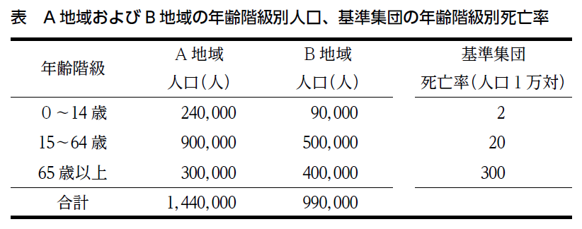 【問】A 地域および B 地域の年齢階級別人口と、基準集団の年齢階級別死亡率を表に示す。A 地域の死亡数は 12, 000人、B 地域の死亡数は 12, 000人であった。標準化死亡比は、表中の基準集団を 100 とする。A 地域と B 地域の比較に関して、この表から読み取れる内容の記述である。最も適当なのはどれか。1つ選べ。